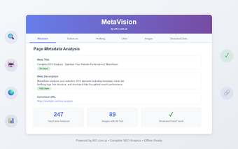 MetaVision - SEO Insights By AIO.com.ai to darmowa aplikacja dla Chrome, należąca do kategorii 'Dodatki i narzędzia'.O MetaVision - Wnioski SEO od AIO.com.ai dla Chrome